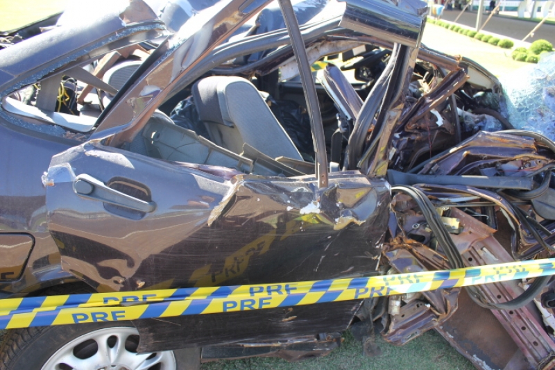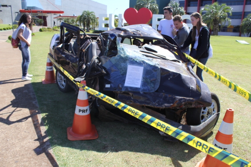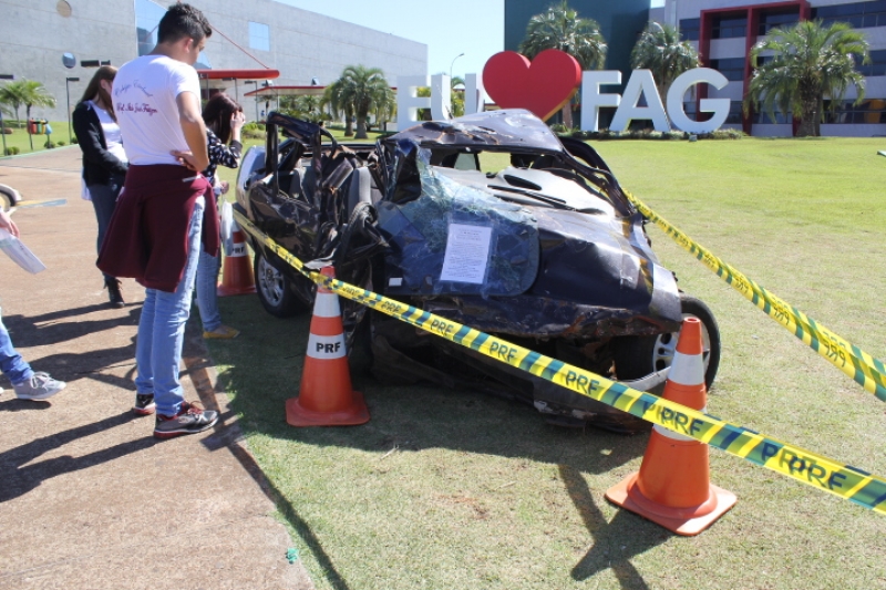 Como complemento das ações da Semana Nacional de Trânsito, um carro envolvido em um grave acidente ficou exposto na entrada do Centro FAG. O veículo foi trazido pela Polícia Rodoviária Federal. Na batida frontal, 5 pessoas morreram.