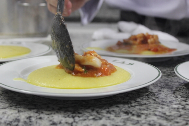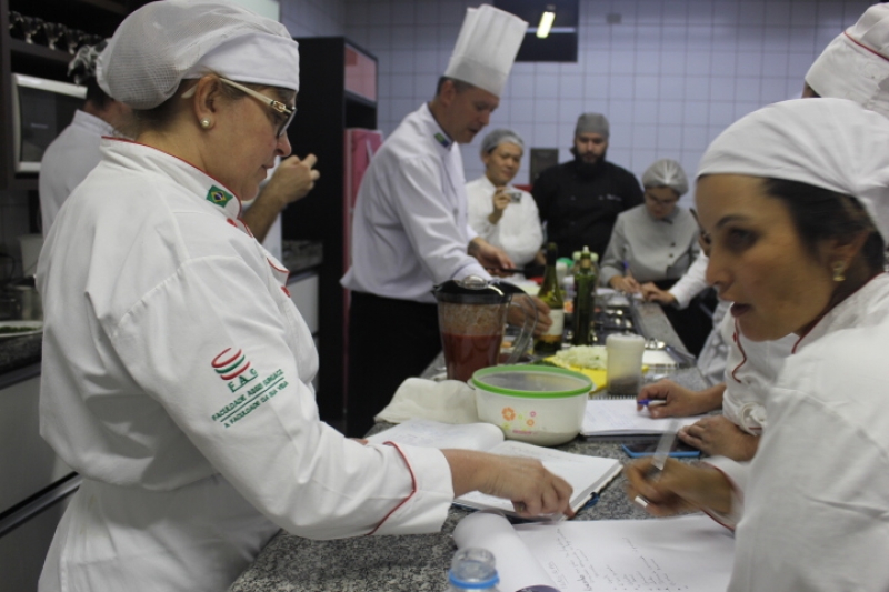 O NAP, Núcleo de Aperfeiçoamento Profissional, promoveu novos módulos dos cursos com o Chef Alexandre Bressanelli. Na quinta-feira (28) foi realizado o "Bistrô FAG", aula que reúne alunos que já concluíram outros cursos para se atualizarem nas técnicas e reencontrar colegas. "Eu chamo isso de um reencontro, a maioria aqui se formou no último curso de 'Chef de Cuisini' e é bacana que nos vemos novamente e aproveitamos para aprender pratos diferentes", afirmou o oftalmologista Cezar Chiratori. Emerson Delazari Donini fala do tema da aula, que foi a ?Cozinha Italiana?, em que aprenderam quatro pratos diferentes com polentas. "Esse curso foi especial, aprendi a fazer polenta com bacalá; com frutos do mar; codorna e com rabada, tudo muito diverso do tradicional", relatou.