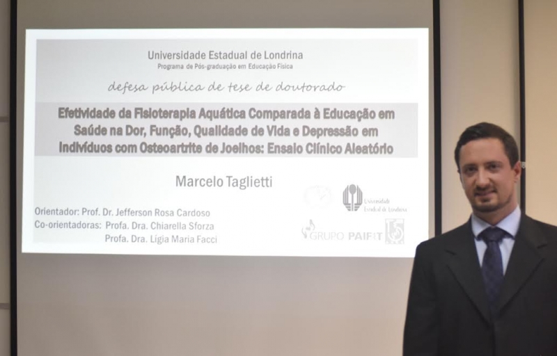 O professor do curso de Fisioterapia do Centro Universitário FAG, Marcelo Taglietti, recebeu, recentemente o título de Doutor pela Universidade Estadual de Londrina - UEL. Parte dos estudos também foi feita na Università Degli Studi di Milano, em Milão, na Itália. Ele, neste semestre, ministra as disciplinas de Cinesioterapia, Patologia, Pesquisa Aplicada a Fisioterapia, Tratamento Estatístico de Dados, Primeiros Socorros, Estágio Supervisionado em Fisioterapia Cardiorrespiratória e Estágio Supervisionado em Fisioterapia Hospitalar. Marcelo desenvolveu o trabalho intitulado: "Efetividade da Fisioterapia Aquática Comparada a Educação em Saúde Sobre a Dor, Função, Qualidade de Vida e Depressão em Indivíduos com Osteoartrite de Joelhos: Ensaio Clínico Aleatório".