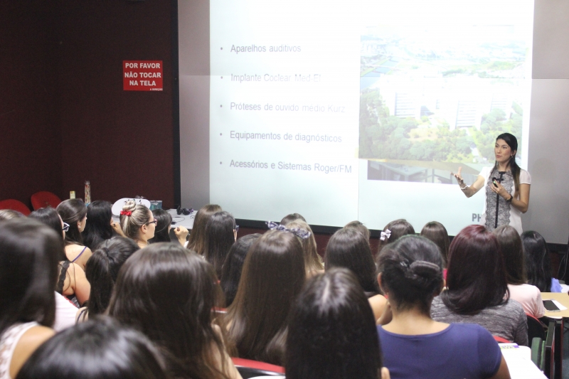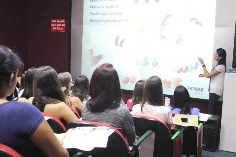 Acadêmicos do curso de Fonoaudiologia do Centro FAG participaram na noite de segunda-feira (07), na Sala 3D do Bloco II, da abertura da Semana Acadêmica que contou com a participação da Fonoaudióloga e Gerente de Produtos Aparelhos Auditivos Phonak, Lia Auer Hoshii, que ministrou a palestra "Novas Tecnologias Aplicadas Aos Aparelhos Auditivos".
