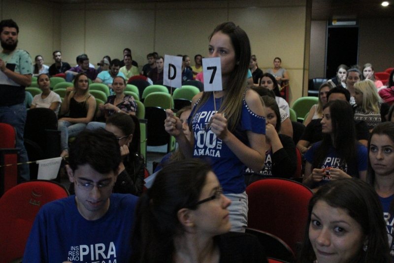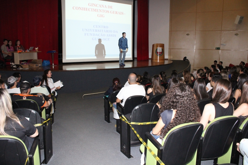 Ontem (17) à noite, os coordenadores dos cursos de Agronomia, Medicina Veterinária, Educação Física, Enfermagem, Nutrição, Fonoaudiologia, Farmácia, Fisioterapia do Centro FAG e Estética e Cosmética da Faculdade Dom Bosco, reuniram os acadêmicos no Anfiteatro da Reitoria para participarem da GIG, Gincana de Conhecimentos Gerais. A atividade foi organizada pelo NAAE, Núcleo de Apoio ao Estudante, e teve como objetivo testar o conhecimento dos alunos para o ENADE, Exame Nacional de Desempenho dos Estudantes, que será realizado domingo (20) no campus do Centro FAG.