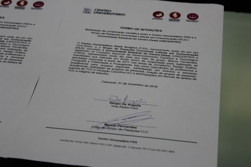 Após conversas entre representantes das Instituições de Ensino Superior, o Centro Universitário FAG e a Unicentro deram o primeiro passo para firmar um Termo de Cooperação Técnico-Científica. O Vice-Reitor do Centro FAG, Sérgio De Angelis, e o Chefe de Gabinete da Reitoria da Unicentro, o Doutor Márcio Fernandes, assinaram um protocolo de intenções, demonstrando o desejo mútuo em manter uma parceria entre os cursos de Comunicação, Jornalismo e Publicidade e Propaganda, comuns nas duas unidades. A assinatura foi acompanhada pela Coordenadora de Publicidade, Laila Rotter Schmidt, pelo Coordenador de Jornalismo, Ralph Willians de Camargo, e pelo Coordenador do Programa de Pós-graduação, Osmar Antonio Conte.