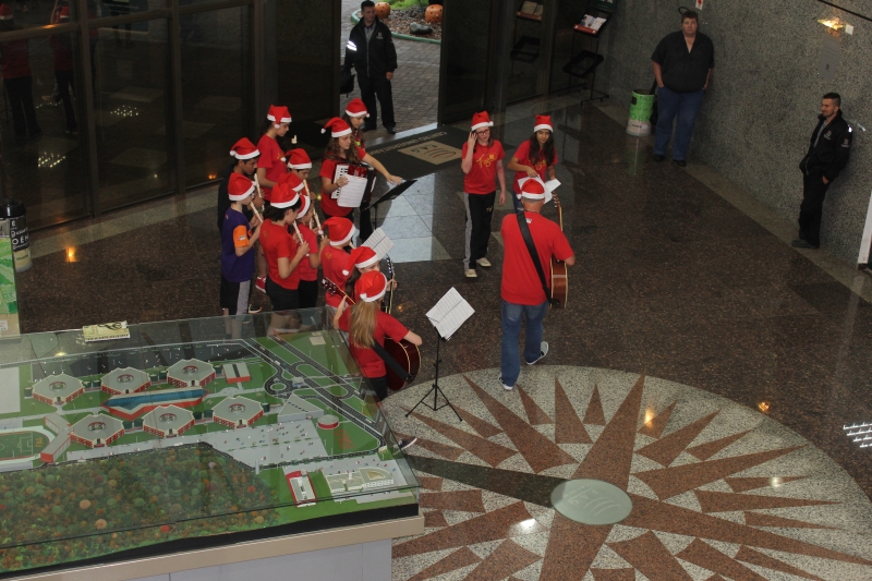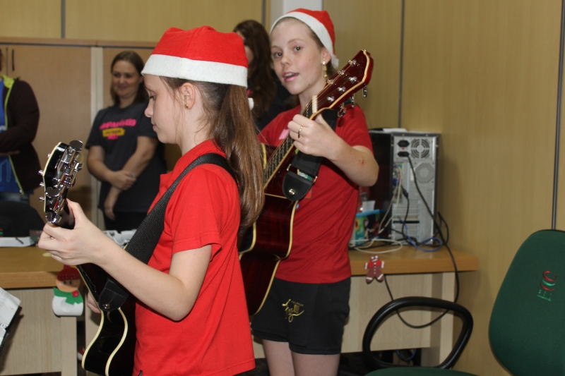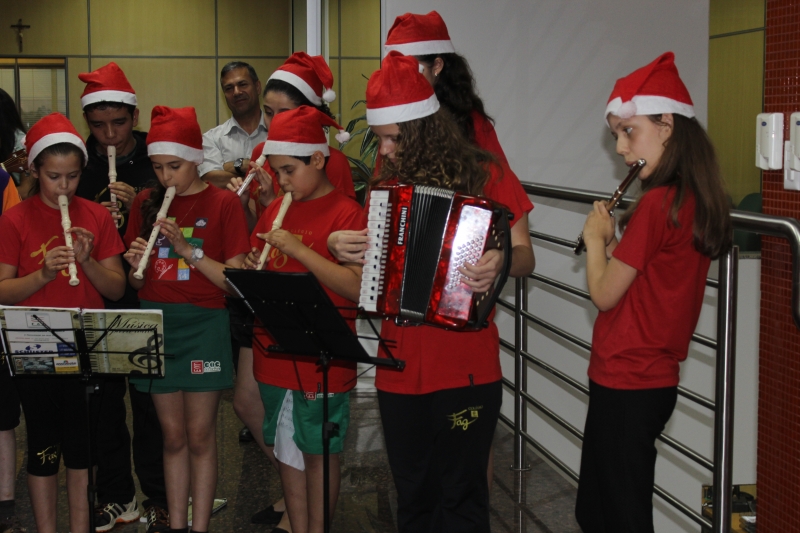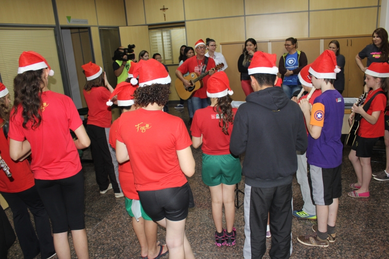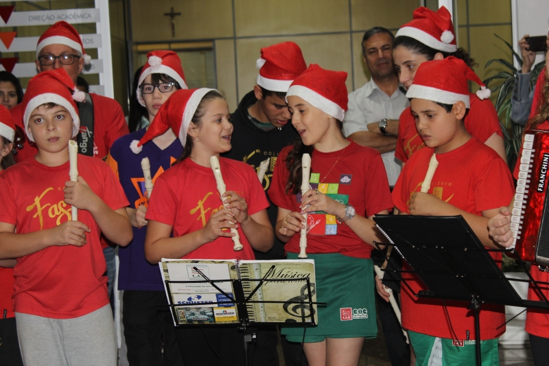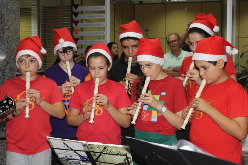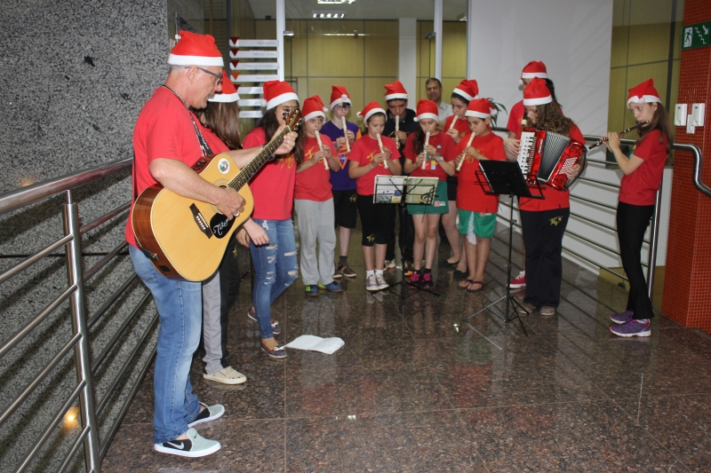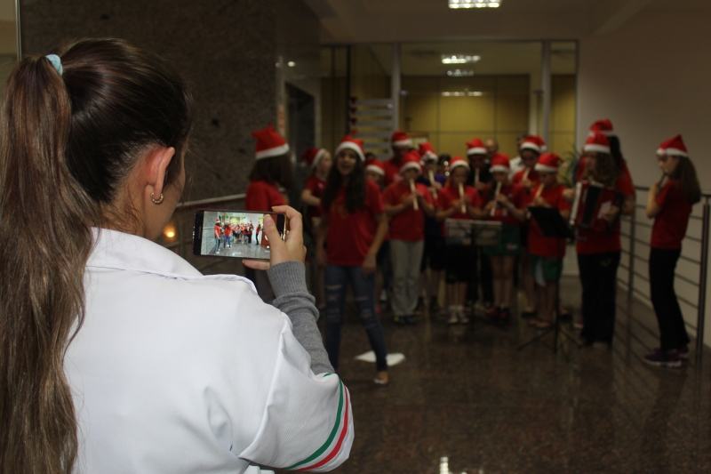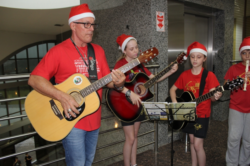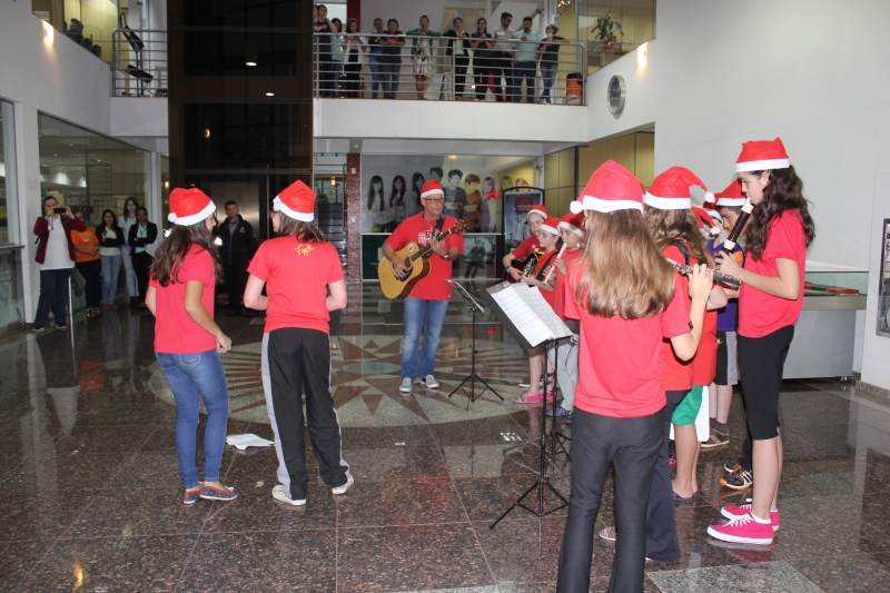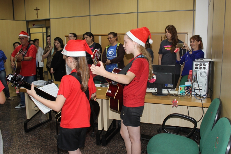 Com voz, violão, acordeão e flauta e devidamente caracterizados com o gorro de papai noel, eles cantaram músicas natalinas e encantaram funcionários e alunos. "Decidimos fazer isso para preparar o clima, para que este Natal seja maravilhoso, com muitas coisas boas", contou o professor. "A gente nunca te se apresentado assim, foi muito legal", falou a aluna Carol Cesconeto. "Eu adoro cantar. Isso me acalma muito", acrescentou Giovana Zat. As duas fizeram a frente da cantoria. "Considero muito interessante o professor incentivar os alunos a ter o espírito natalino e também a tocar os instrumentos. As famílias realmente estão precisando disso, desse clima de união", opinou a secretária de diretoria, Maria Clara Grolli.