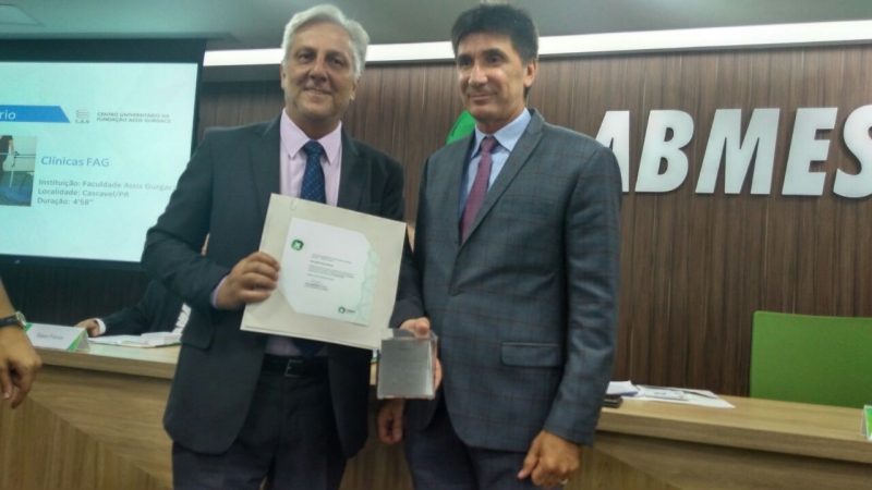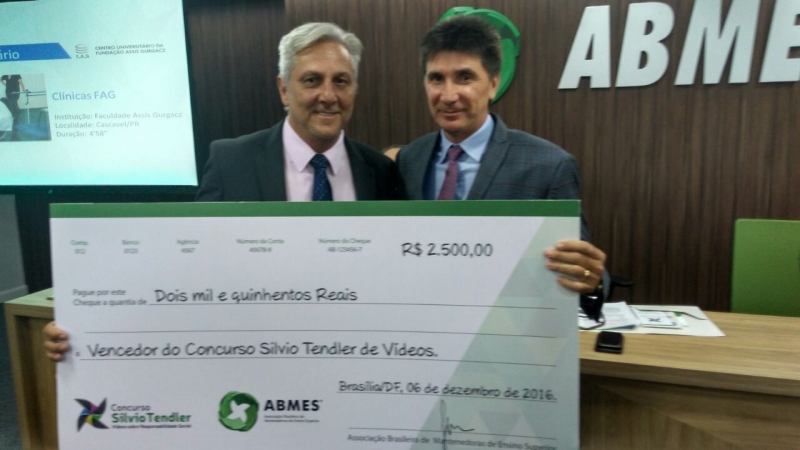 A premiação aconteceu hoje (06) na sede da ABMES em Brasília. O prêmio, no valor de R$2500,00, foi entregue pelo presidente José Janguiê Bezerra Diniz e recebido pelo Coordenador da emissora universitário. Luiz Sonda. O vídeo foi produzido pela equipe da TV - Luiz Sonda, Luiz Marcondes e Cristiane Canassa -, e contou com o apoio da coordenadora das Clínicas, Leda Paes Walker, que indicou os personagens, entre pacientes e alunos. "Gravamos por dois dias e depois levamos mais uma semana para finalizar a edição", destaca o diretor da TVFAG.