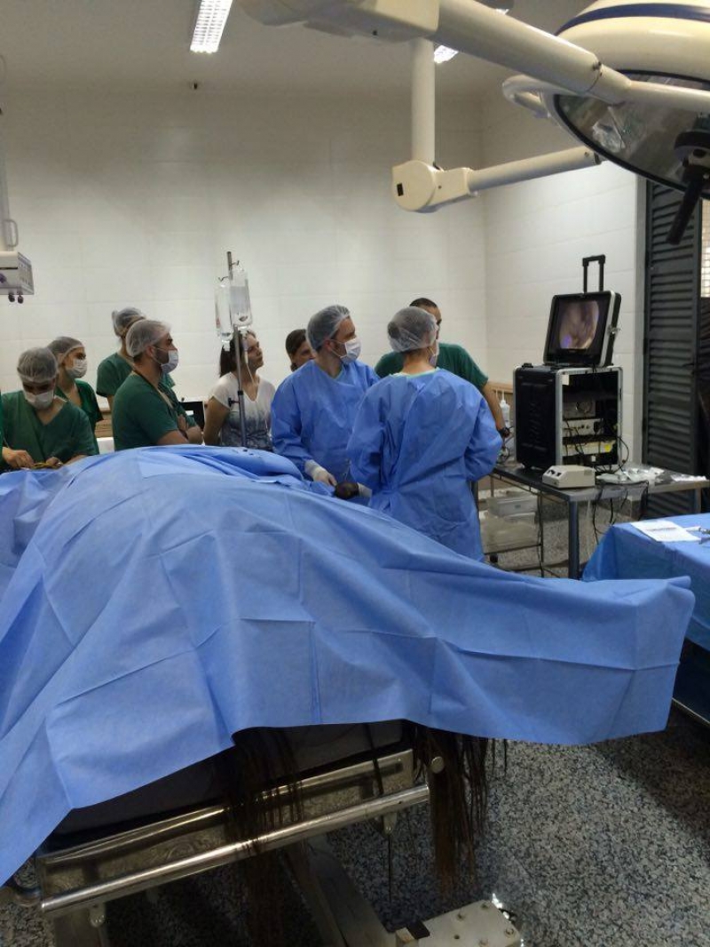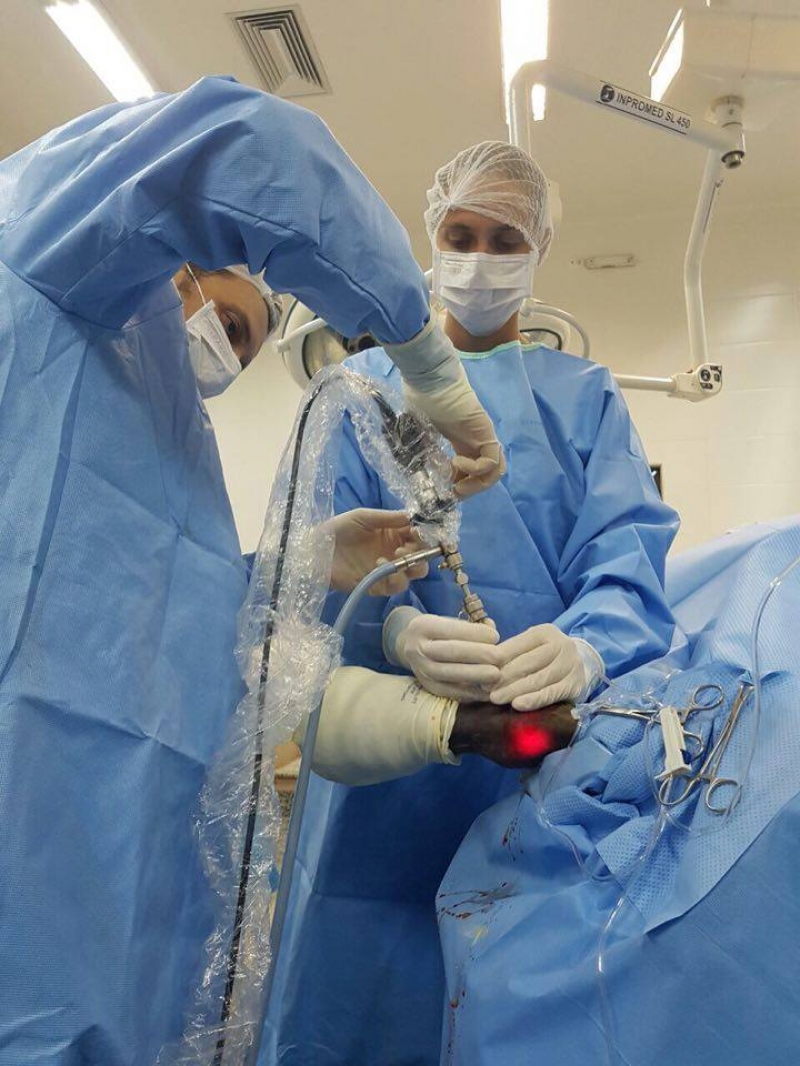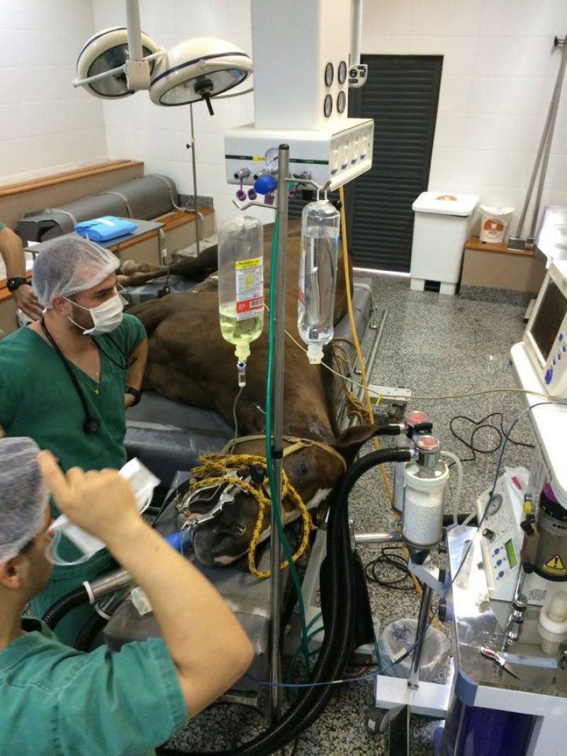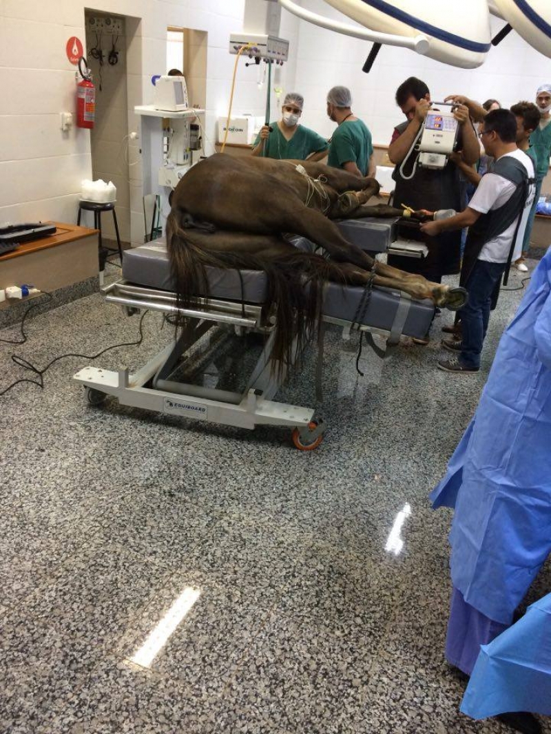 A égua de alto valor foi internada na última segunda-feira (12), para permanecer em jejum e ser preparada para a operação. O procedimento cirúrgico aconteceu na terça-feira (13) e foi conduzido pelo cirurgião da Universidade Federal do Paraná, Peterson Triches, que veio de Curitiba para a operação, com apoio da equipe do Hospital Veterinário FAG. A égua passou por uma Artroscopia para a remoção do fragmento. "É uma cirurgia pouco invasiva, com anestesia geral. São feitas duas incisões, bem pequenas, de menos de 1 cm: em uma é colocada uma lente com luz e uma câmera, e por outro orifício entra o material cirúrgico utilizado. Acompanhamos tudo por um monitor. A cirurgia demorou cerca de 50 minutos. Mas foram três horas no total, entre a sedação e a remoção do animal até a baia", contou o Diretor do Hospital, Rennê Gomiero.
