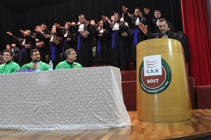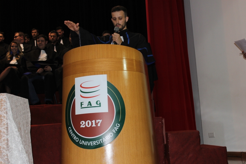 A sessão foi presidida pelo Vice-Reitor do Centro FAG, Sérgio De Angelis. Além dele, compuseram a mesa de honra a Secretária Acadêmica, Sr.ª Maria Madalena de Camargo; Coordenador do Curso de Engenharia Mecânica, Prof. Emerson Eduardo Formigoni; o Paraninfo do Curso de Engenharia Mecânica e Patrono do Curso de Engenharia de Controle e Automação, Prof. Geovane Duarte Pinheiro; o Patrono do Curso de Engenharia Mecânica, Prof. Carlos Alberto Breda; o Homenageado como Nome de Turma de Engenharia Mecânica, Prof. Carlos Eduardo Goulart Ferreira; o Coordenador do Curso de Engenharia de Controle e Automação, Prof. Vânio Da Maia; o Paraninfo do Curso de Engenharia de Controle e Automação, Prof. Ederson Zanchet; e o Homenageado como Nome de Turma de Engenharia de Controle e Automação, Prof. Ewerson Luiz Poisk.