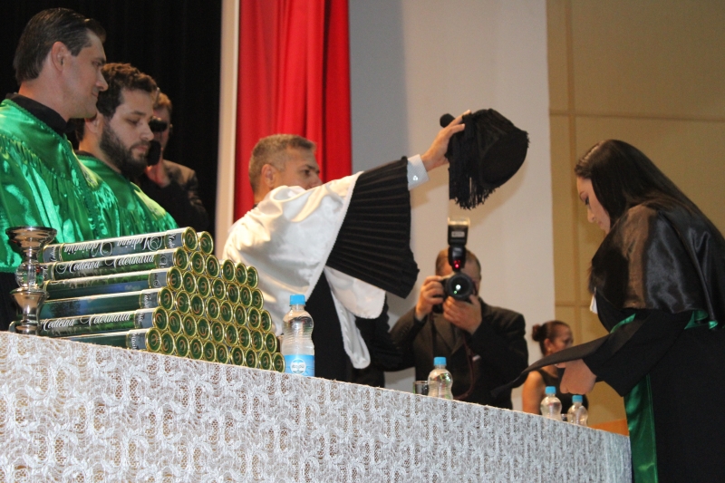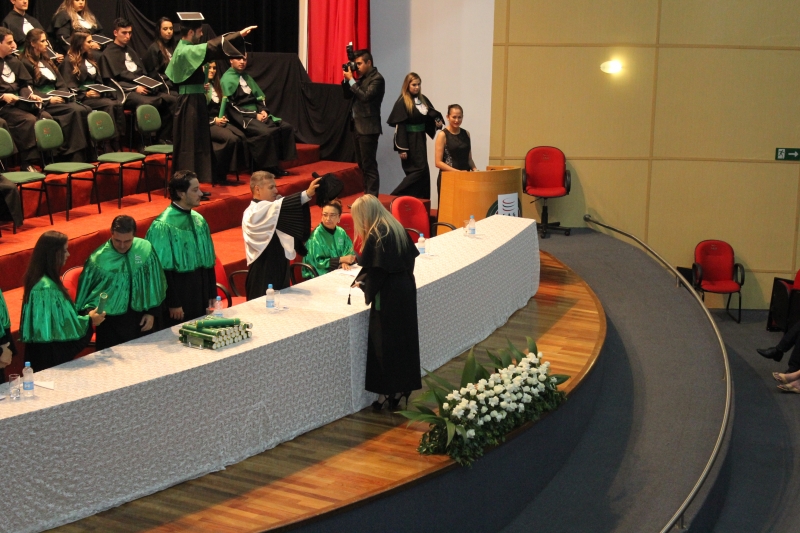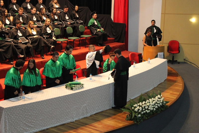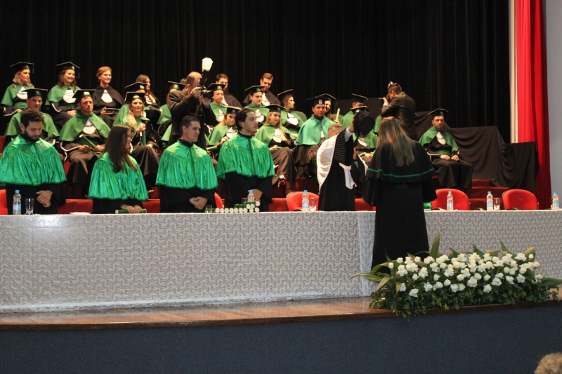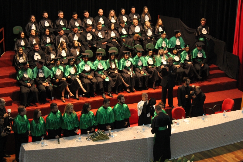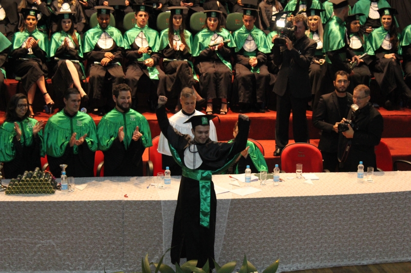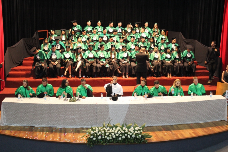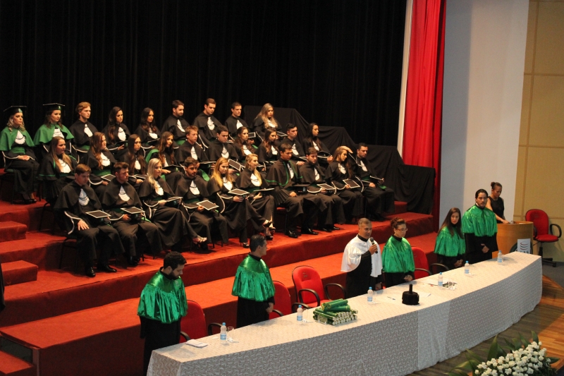 A primeira solenidade foi realizada às 17h e voltada para a turma do Integral. A turma escolheu como Paraninfo o Prof. Marcelo Morato da Silva, Patronesse a Profª. Anabella Mira e, o Prof. Edmilson Santos de Freitas como Nome de Turma. A segunda solenidade aconteceu às 20h e foi voltada para Turma I e II noturno. A turma escolheu a Profª. Laura Helena França de Barros Bittencourt como Paraninfa, Prof. Cesar Leandro Drehmer foi o Patrono e a Profª. Meiriele Monique Covatti Piassa foi homenageada como Nome de Turma. Já a turma II escolheu para Paraninfo o Prof. Marcelo Morato da Silva, como Patronesse a Profª. Vivian Fernanda Gai Valter e homenageado como Nome de Turma o Prof. Diego Lacir Froehlich. Todos compuseram a mesa de honra junto ao presidente da sessão o Vice-Reitor, Prof. Sérgio De Angelis, do coordenador, Prof. Adriano Camargo e da Secretária Acadêmica, Maria Madalena de Camargo.