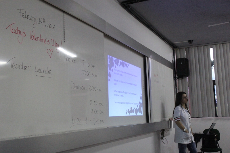 A professora Leandra Fumagalli em sua aula contou sobre a história da data dos "Dias dos Namorados" comemorado no dia 14 de fevereiro em vários países