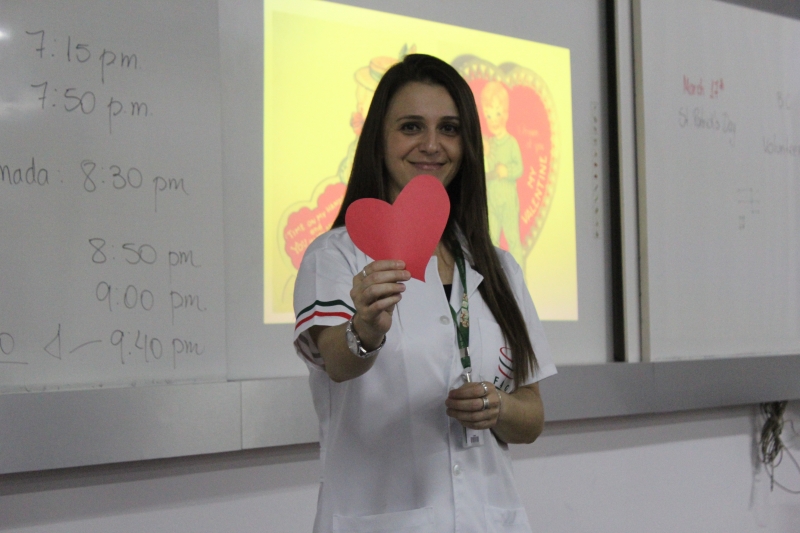 Para lembrar o "Valentine's Day", data comemorada no dia 14 de fevereiro em vários países do mundo, a professora Leandra Fumagalli organizou uma atividade com os alunos do 5º período do curso de Letras. "Essa atividade faz parte da grade curricular da minha disciplina que é a Língua Inglesa. Os alunos precisam conhecer a cultura de outros países, então, eu falei hoje aqui sobre a história dessa data que tem o Santo Valentin como personagem principal", explicou a Teacher.
