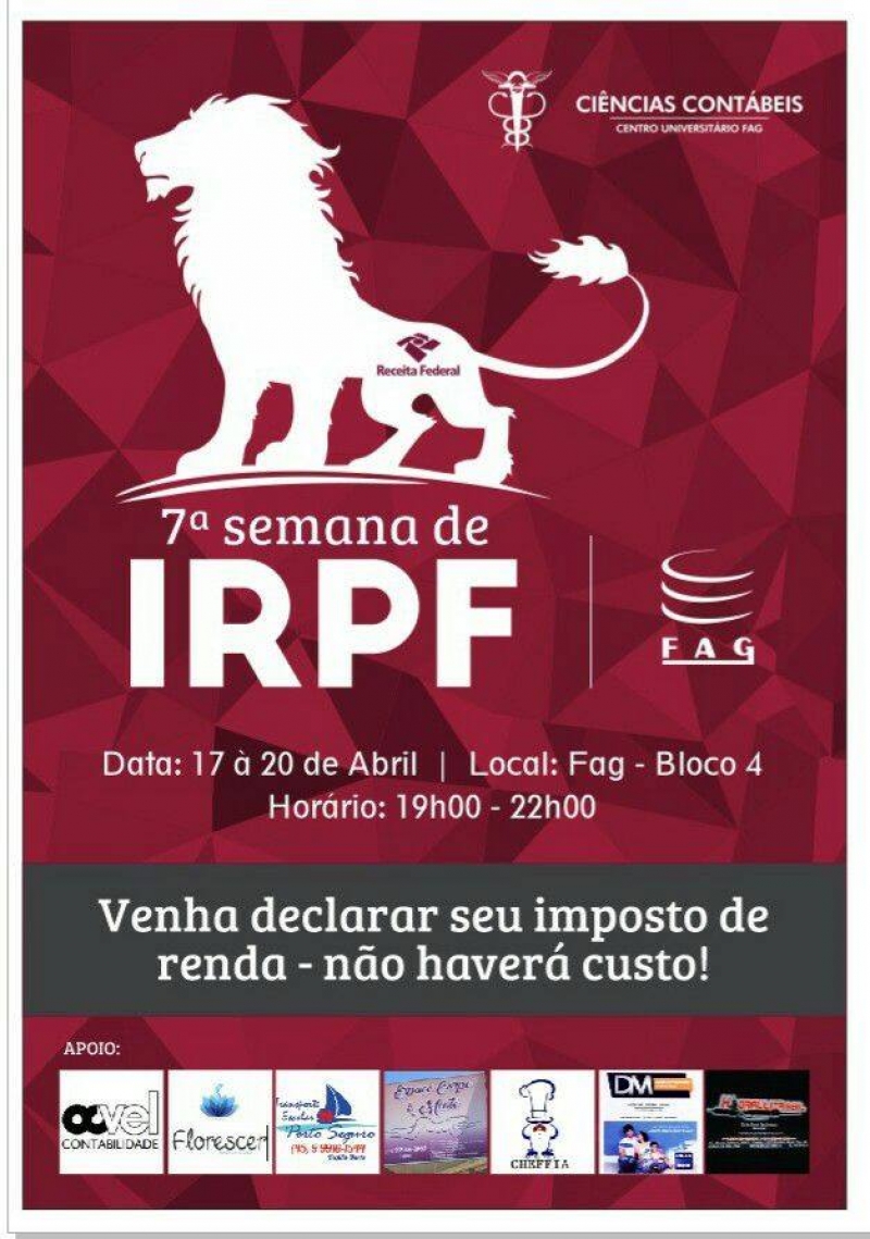 Os acadêmicos do 7º período do curso de Ciências Contábeis do Centro Universitário FAG promovem, entre os dias 17 e 20 de abril, a 7ª edição da "Semana do IRPF". Os alunos estarão à disposição para sanar dúvidas e também para fazer as declarações de Imposto de Renda Pessoa Física de forma gratuita. O atendimento será das 19h00 às 22h00, na área de convivência do Bloco 04. A ação é direcionada aos alunos, professores, funcionários e comunidade. A ação faz parte do Estágio Supervisionado, sob a coordenação da professora Suzana Burin.