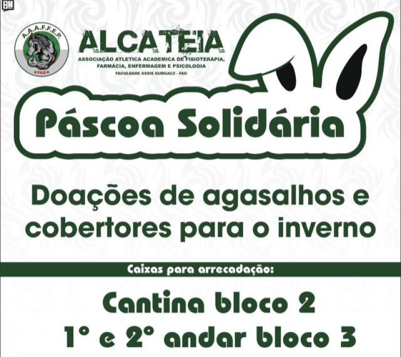 A Associação Atlética Acadêmica de Fisioterapia, Farmácia, Enfermagem e Fisioterapia - Alcateia - está realizando a campanha "Páscoa Solidária". Apesar do nome, a ação não arrecada doces, mas sim, quer esquentar o inverno de pessoas carentes. Caixas estão disponíveis na cantina do bloco 2, e no 1º e 2º andares, para quem quiser doar agasalhos e cobertores.