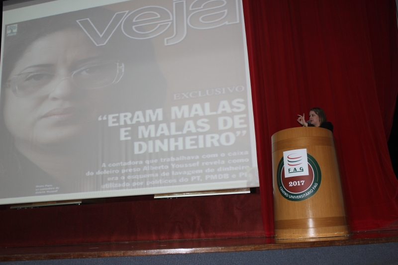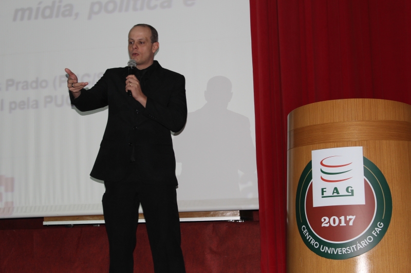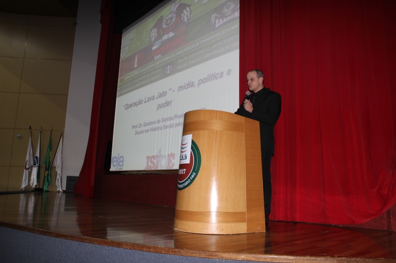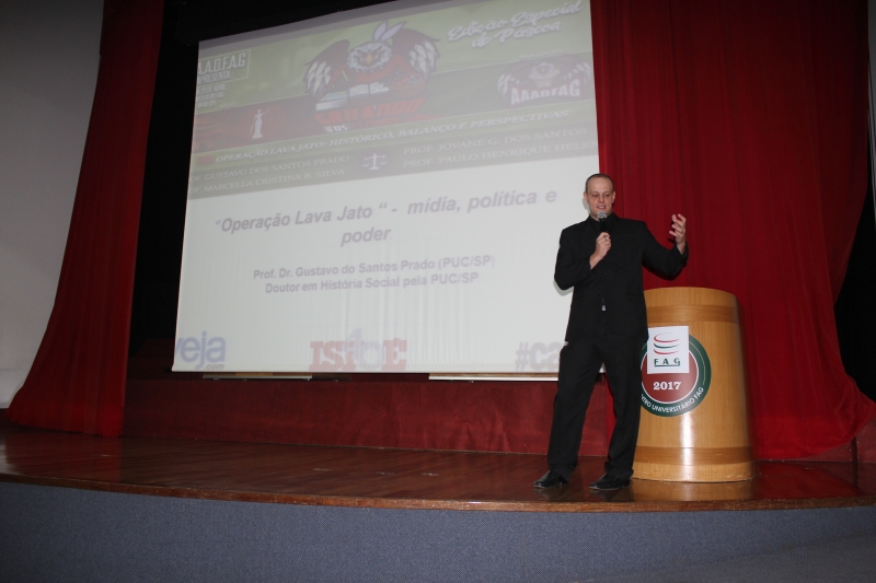 O último a usar a palavra foi o professor Gustavo Prado. A abordagem dele foi sobre a Lava Jato e o papel da mídia. "Fiz o recorte da cobertura em três revistas semanais: Carta Capital, Veja e Istoé. Trouxe mais clareza para os acadêmicos, uma vez que eles têm contato com esses meios de comunicação, mas não conhecem a linha editorial, o posicionamento histórico. Coloquei aos acadêmicos que essas revistas são um meio de informação, porém, parcial", enfatiza.