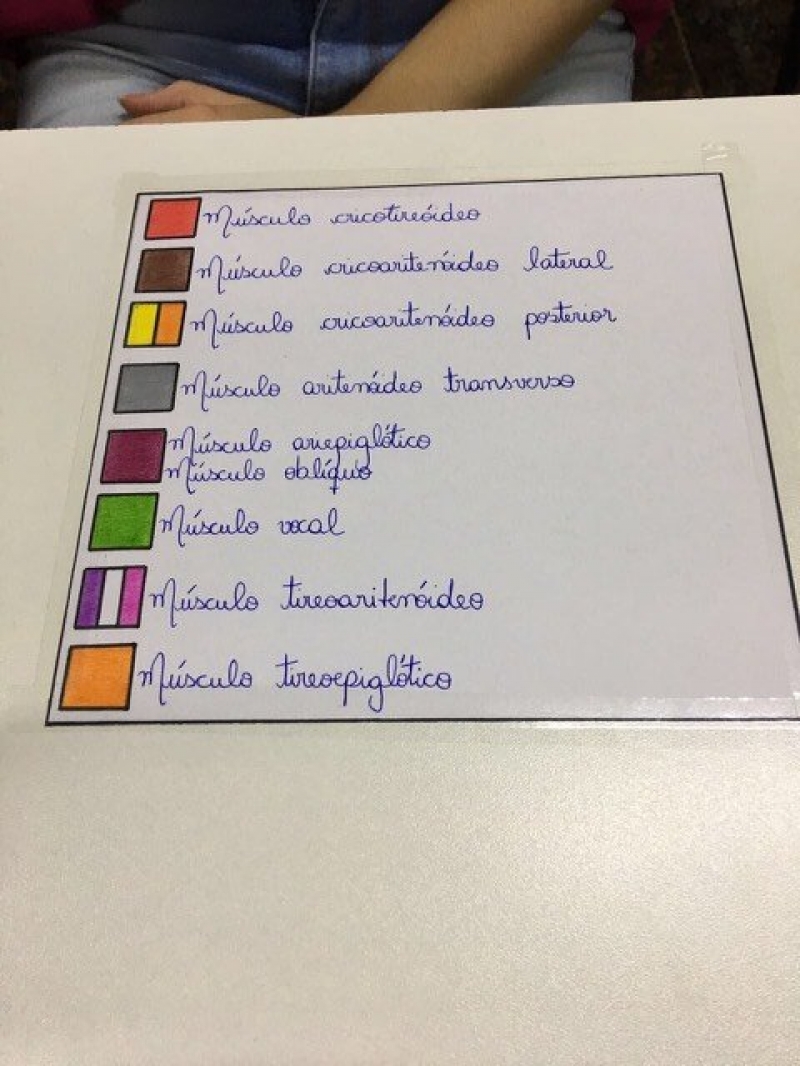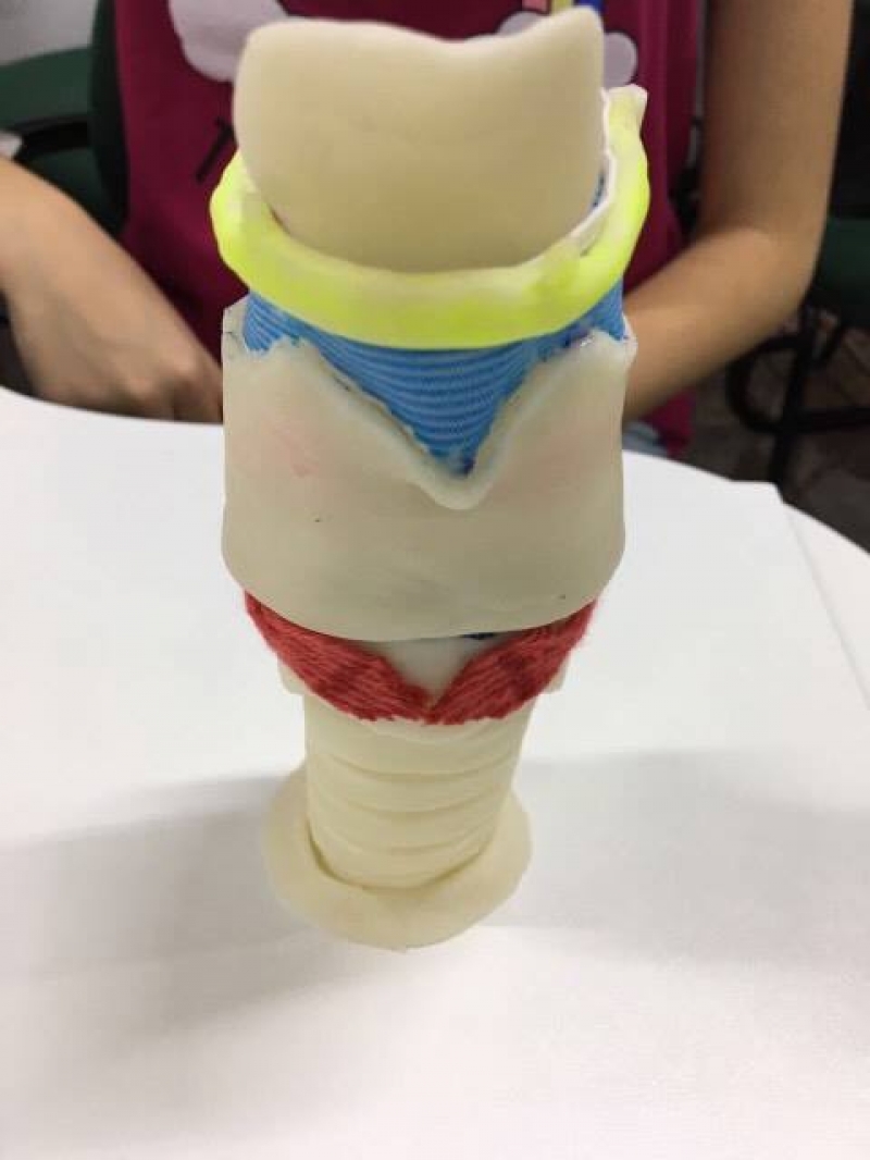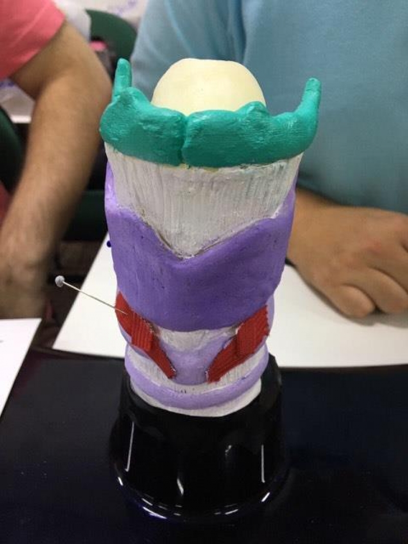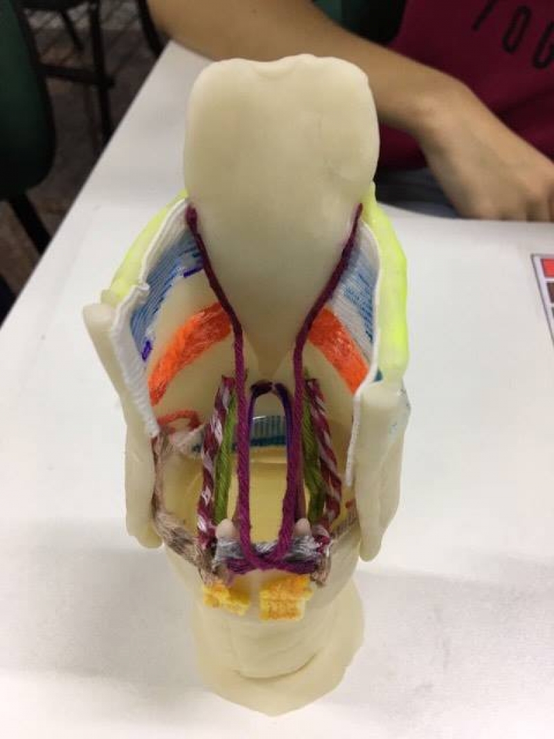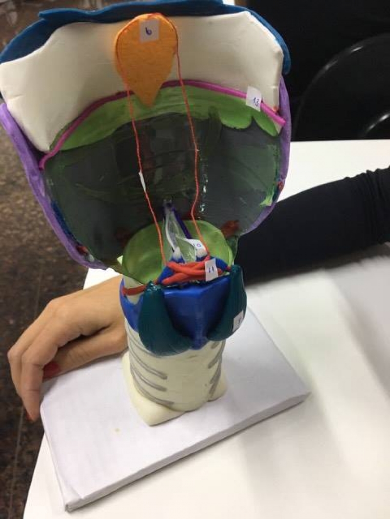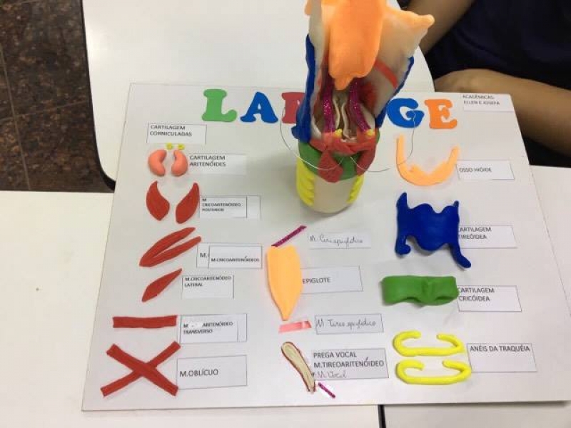 Para as peças, eles utilizaram materiais recicláveis, biscuit e EVA. Os acadêmicos precisaram sinalizar as estruturas laríngeas, desde osso, cartilagens e músculos. "Isso além de facilitar o entendimento da fisiologia vocal para o aluno de Fonoaudiologia, facilita como meio de estudo a longo prazo, pois após a fisiologia boca o aluno também aprende as alterações vocais que temos durante formação de Fonoaudiologia", explica a professora, que complementa dizendo que "alguns alunos em outras experiências usam esta peça para os atendimentos em voz que são realizados nas Clínicas FAG, facilitando também que o paciente compreenda a fisiologia vocal".