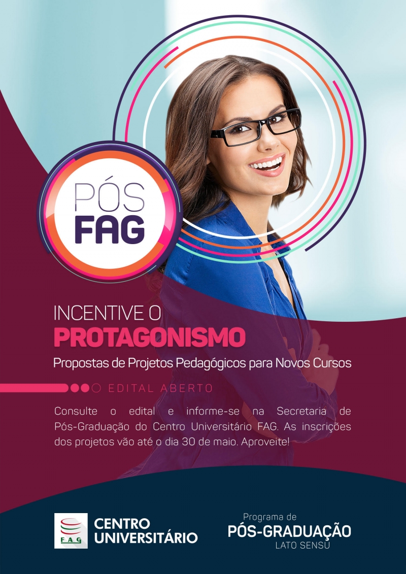 Os docentes e servidores técnico-administrativos do Centro Universitário FAG são convocados a propor Projetos Pedagógicos de Pós-graduação Lato Sensu (Especialização ou MBA), com implantação a partir do segundo semestre de 2017, para os campi Cascavel e Toledo. O programa de Pós-graduação lançou edital para receber ideias de cursos que sejam de interesse do Centro FAG ou de empresas conveniadas.