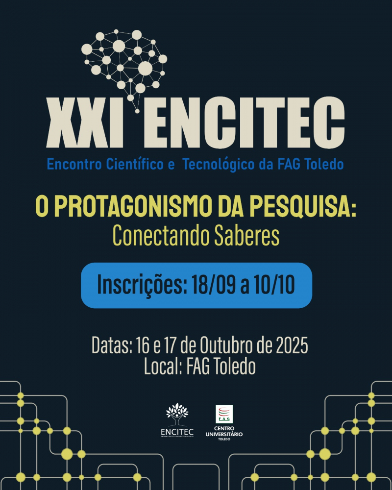 A FAG Toledo acaba de abrir as inscrições para o XXI Encontro Científico e Tecnológico (ENCITEC), que nesta edição terá como tema "O Protagonismo da Pesquisa: Conectando Saberes". O evento chega à 21ª edição como um dos grandes incentivadores da produção científica na região, acumulando ao longo dos anos o reconhecimento da comunidade acadêmica pela valorização dos trabalhos de alunos e professores pesquisadores. "A pesquisa é um dos pilares da formação acadêmica, e o ENCITEC fortalece a nossa missão institucional de contribuir para o desenvolvimento regional e nacional, ao estimular a socialização de saberes e a troca de experiências entre diferentes áreas do conhecimento. Além disso, valoriza o trabalho acadêmico produzido e reafirma o compromisso com a inovação, o desenvolvimento social e a difusão da ciência em sua dimensão formativa e transformadora. Incentivar a construção do pensamento crítico é também preparar profissionais mais qualificados e socialmente comprometidos", destaca a coordenadora administrativa da FAG Toledo, Maristela Bendo.